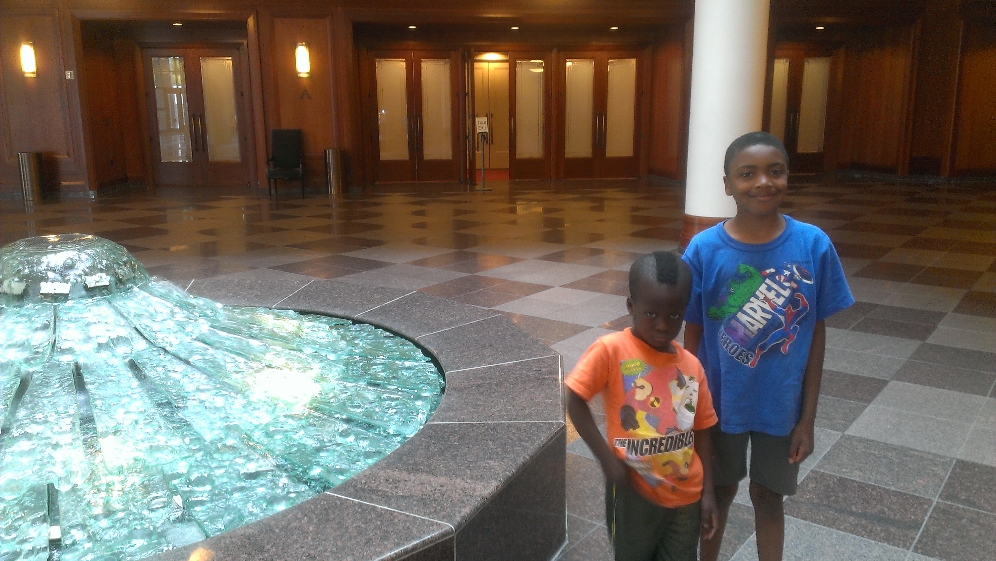 Gabe and Max walking toward the outside of one of the skylights. And, yep, more fountains.