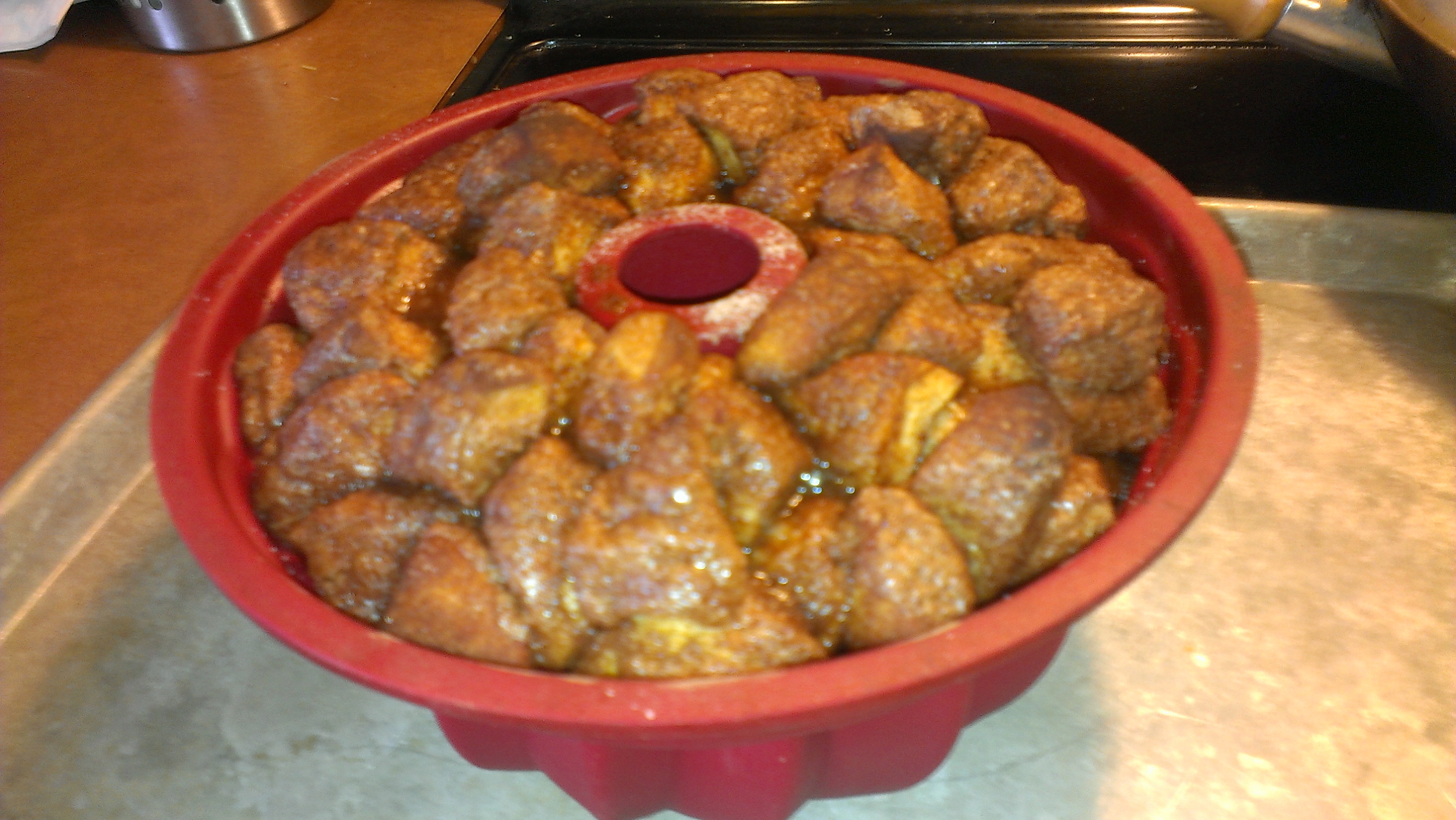 Monkey bread will come out of the pan shaped like this. Use a fork, or you fingers to pull the pieces apart but you probably want to wait until it’s cooled some.