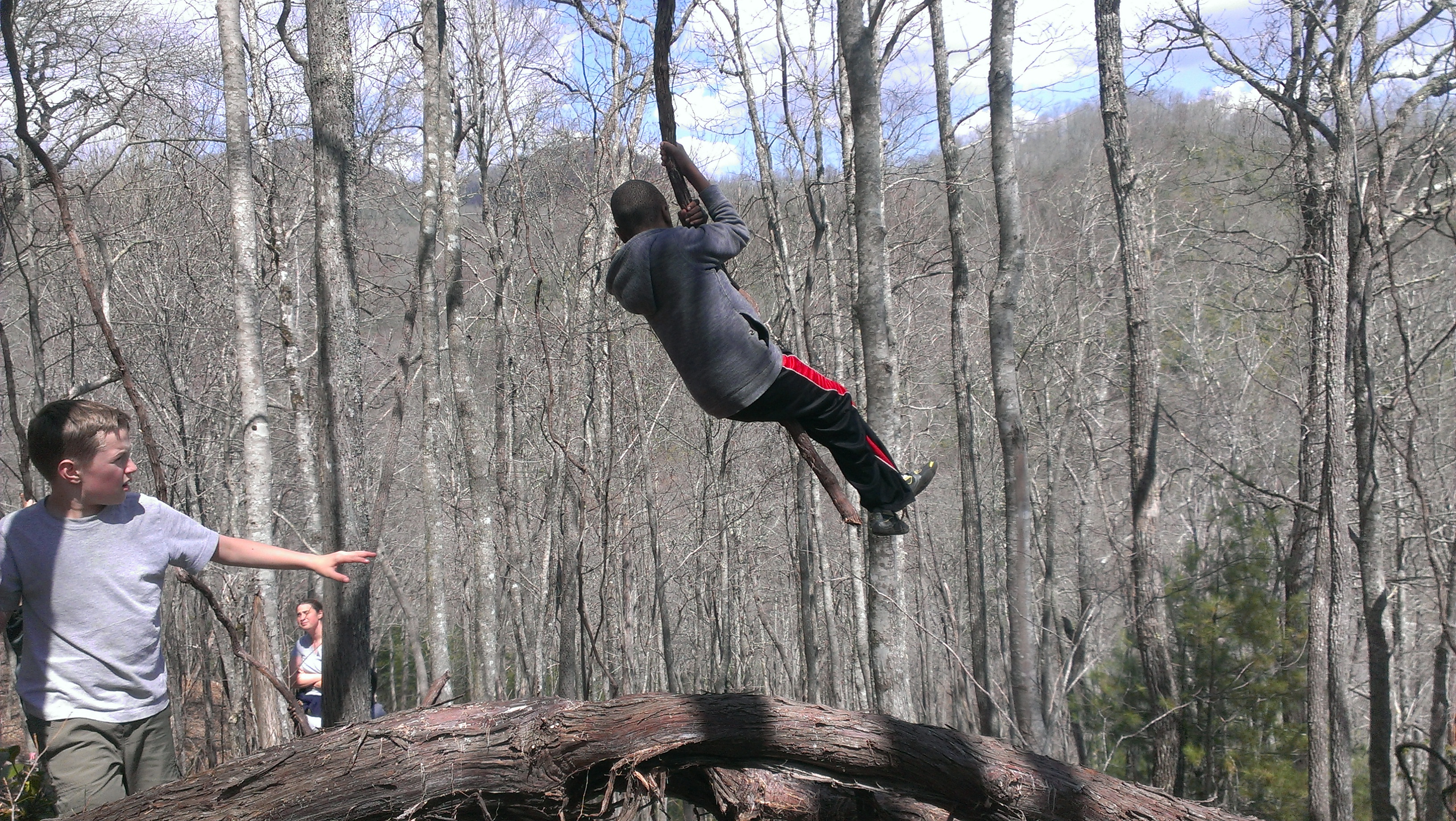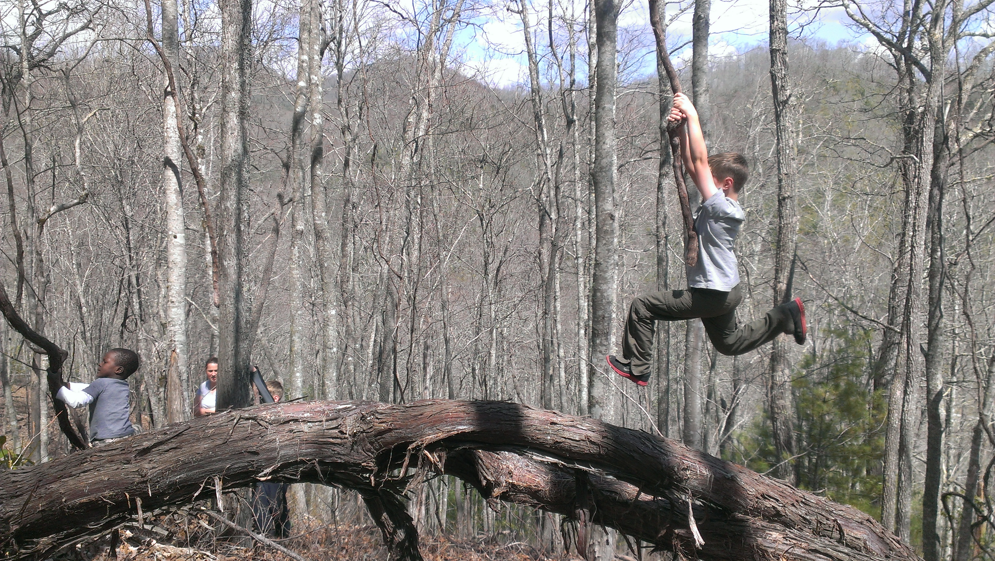 Climb up the steep mountain behind the cabin and you will find the Vines. As near as I can tell, these are thick vines that long ago climbed up some trees up there. The Henrie boys have each claimed one and use them to swing off the side of the mountain out into open air.