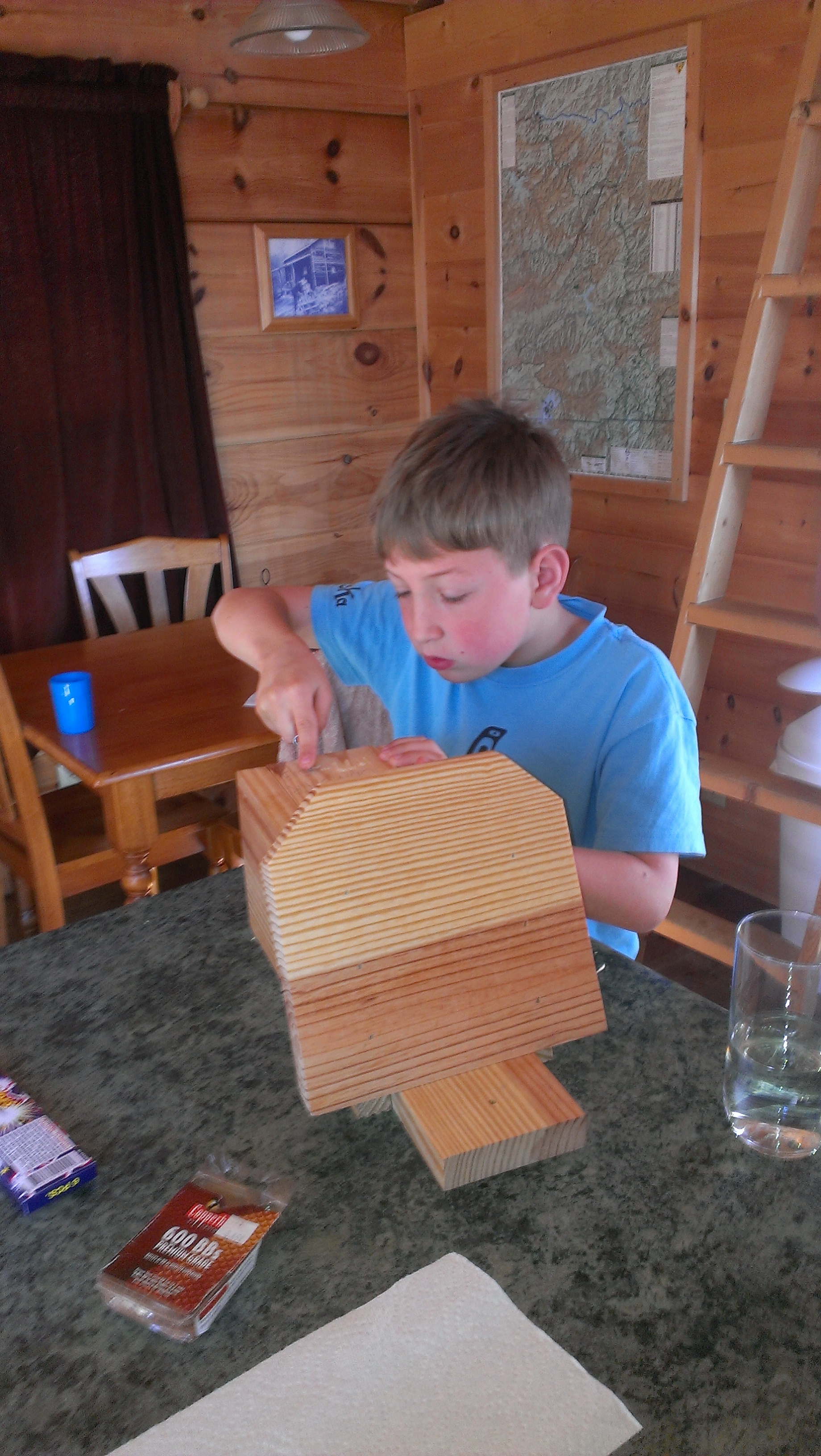 These carving pictures show Mary’s boys carving our brother John’s name into a birdhouse. John passed away last year and we were all there together on the first anniversay. We hung the tree up above the cabin.