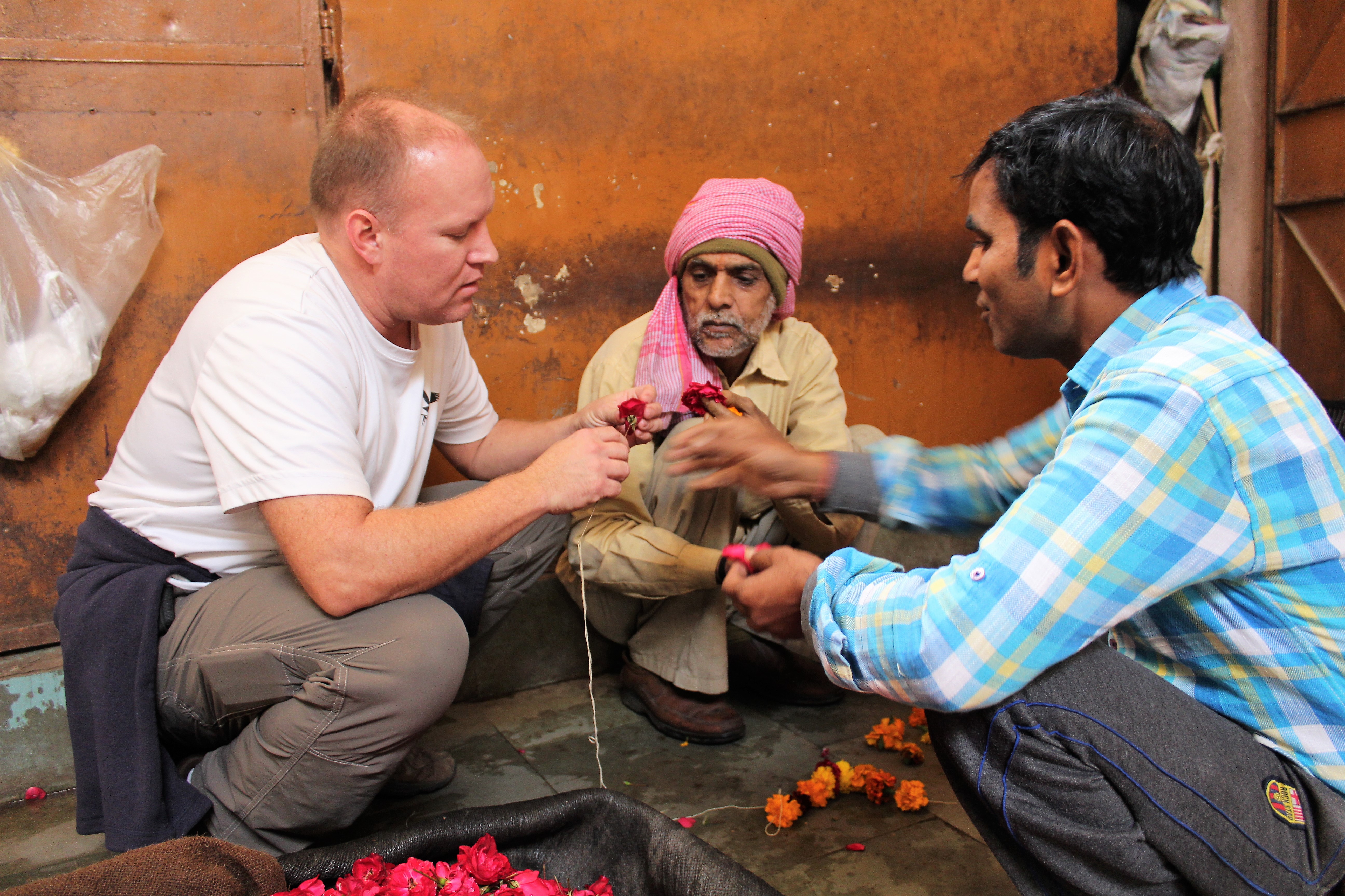 Mike learning how to string the flowers into garlands.