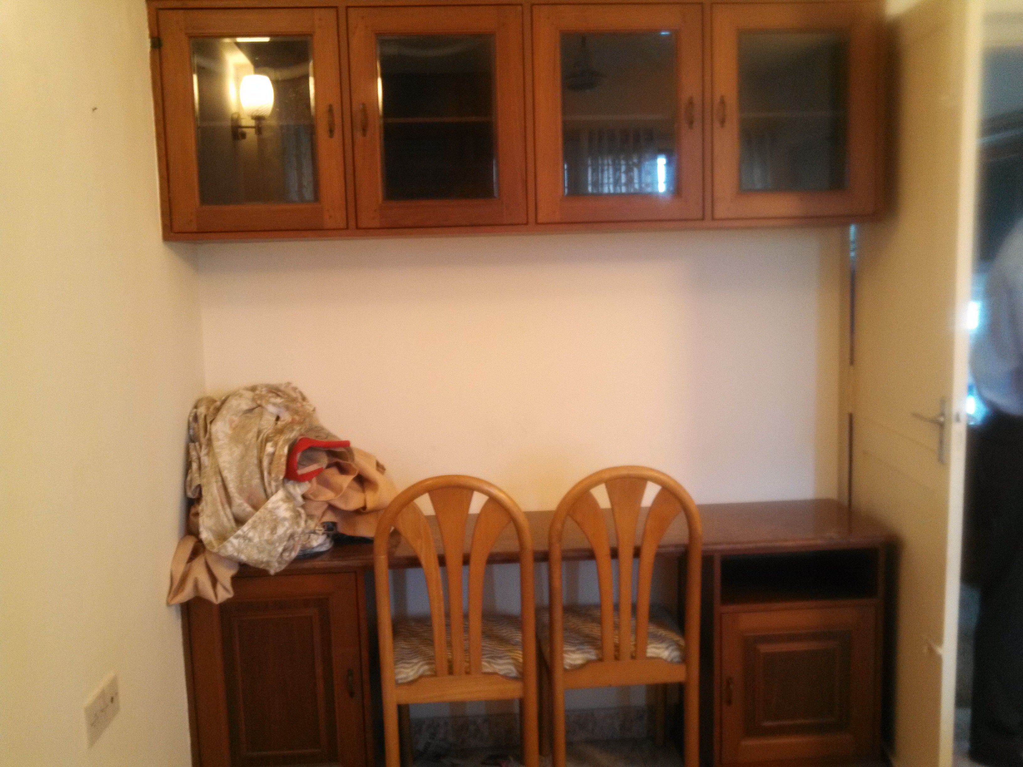 Behind the love seat you can see the dining room seating and the built in buffet along the back wall. This apartment has built ins in every room. Tons of storage!